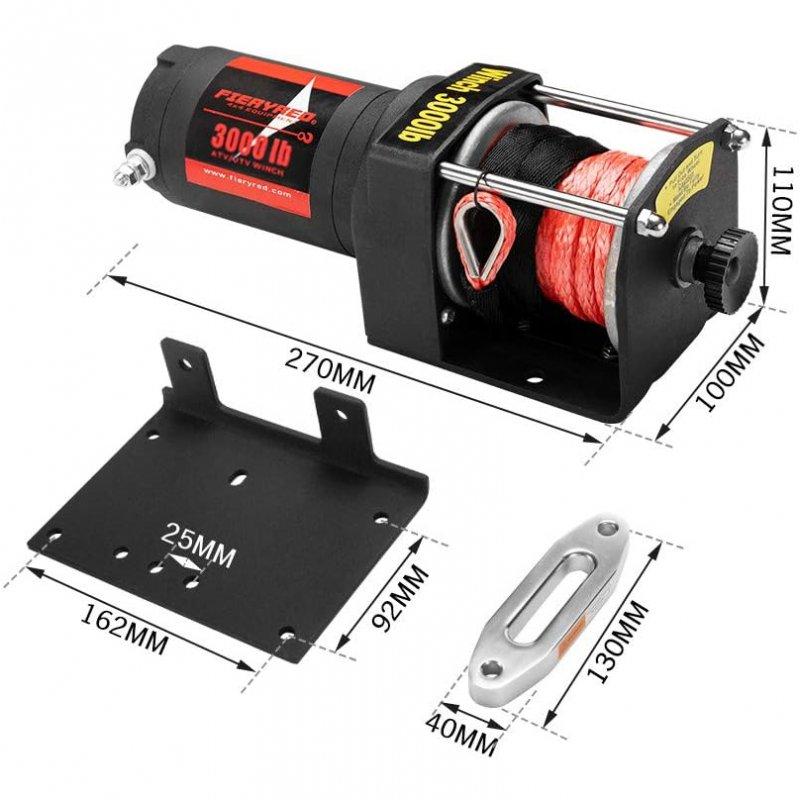 Лебідка FieryRed 3000 укомплектована надійним двигуном, що працює від акумулятора 12 вольт, синтетичним тросом, довжиною 14 м і автоматичним гальмом, що міцно фіксує квадроцикл у потрібному положенні. Швидкість накрутки троса – 1,3 м/хв. За його правильне та рівномірне укладання відповідають роликові напрямні (клюз). Ефективність в управлінні забезпечується якісним дротовим пультом (кріпиться на кермо). У комплект входить також два дистанційні пульти з радіусом дії до 25 м.