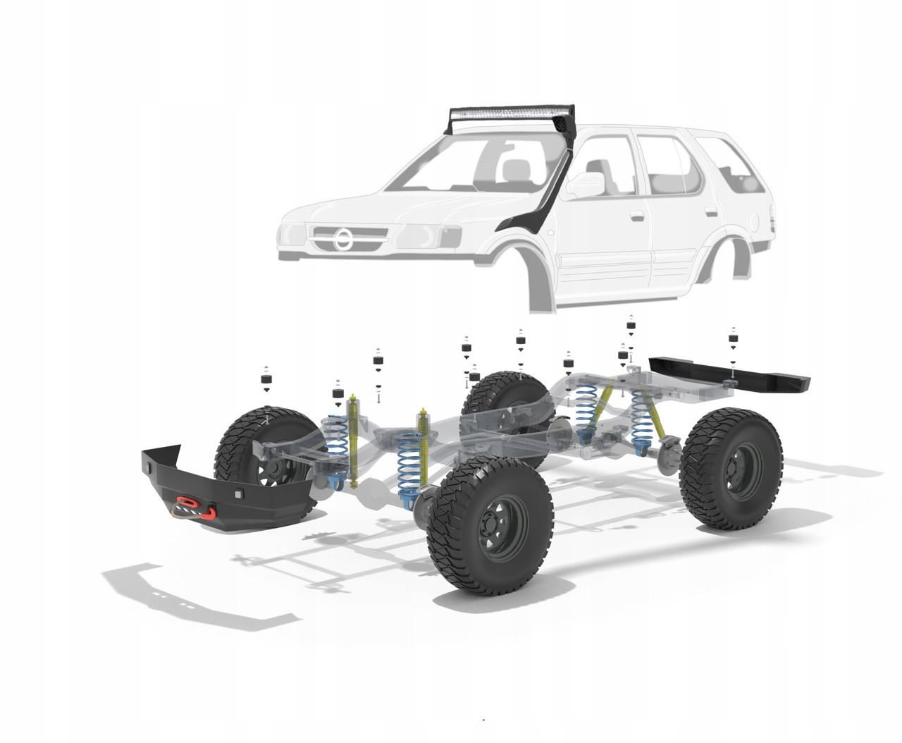 Комплект для боді ліфта 50мм Opel Frontera. Боді-ліфт піднімає кузов відносно рами позашляховика, тим самим дає можливість поставити колеса більшого діаметру зі штатною підвіскою, без різання арок. Боді-ліфт - доступна альтернатива (або доповнення) дорожчим ліфт-комплектам підвісок (пружин та амортизаторів). Комплект виготовлений спеціально для даної моделі позашляховика з урахуванням його конструктивних особливостей. НЕ є штатною заміною подушок кузова.